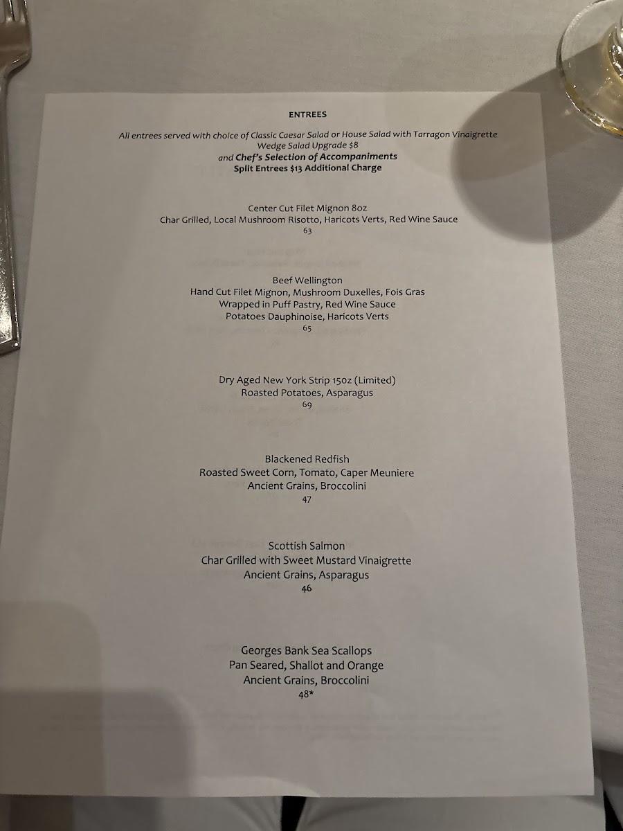 Filet mignon, mushroom duxelles, foie gras wrapped in puff pastry, and red wine sauce.